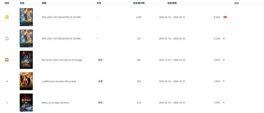 从投放微短剧来看,ShortMax投放以本土剧为主,近7天,ShortMax共投放756部微短剧,TOP10均为本土剧。其中《TOO LATE! THE DAUGHTER OF OLYMPUS FORSAKES YOU[Updating]》投放素材量最高,占比9.55%。