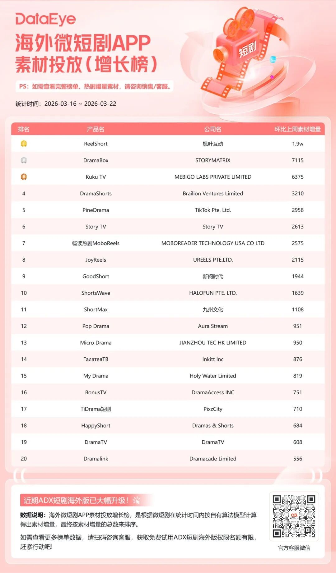 本期(3月16日-3月22日)DataEye海外微短剧APP素材投放增长榜ReelShort登顶,DramaBox位列第二,Kuku TV位列第三。