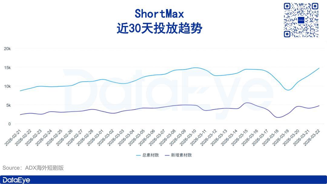 ADX海外短剧版数据显示,近30天,ShortMax投放力度总体呈上涨趋势,日投放素材量由最初的9千组左右上涨至近期的1.5万组左右。