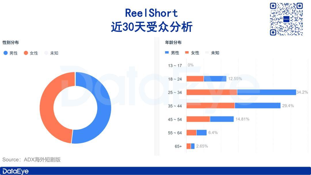 从受众分布来看,近30天ReelShort用户群体男女比例较为均衡,其中男性用户占比稍高,达51.83%,女性用户占比48%。从年龄分布来看,青年用户为其主要受众群体,其中25-34岁用户占比最高,达34.2%,35-44岁紧随其后,占比29.4%,45-54岁用户占比14.81%。