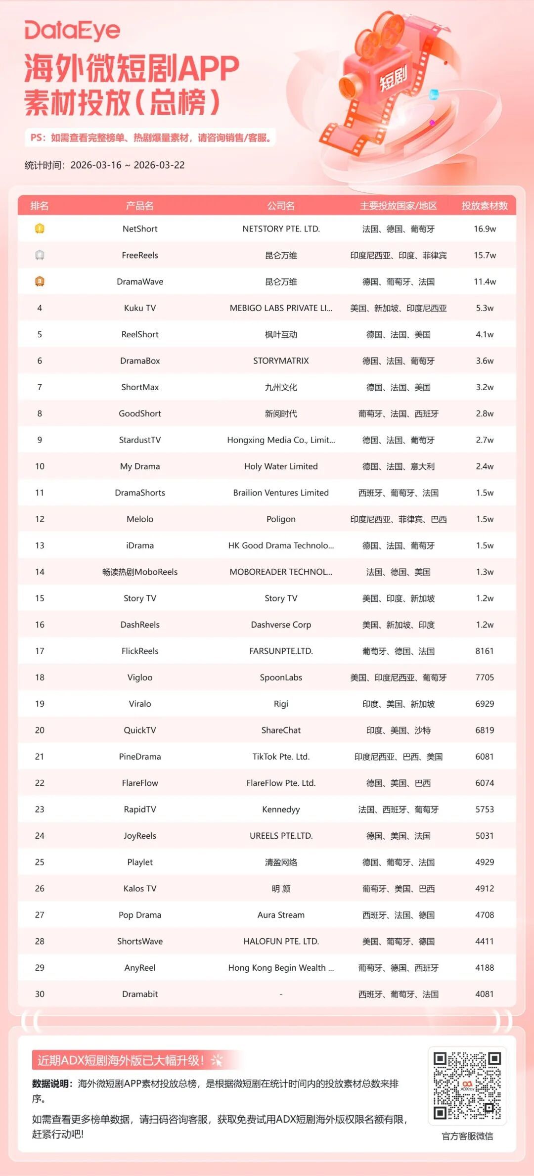 本期(3月16日-3月22日)DataEye海外微短剧APP素材投放榜,NetShort蝉联榜首,素材量16.9万;FreeReels位列第二,素材量15.7万;DramaWave位列第三,素材量11.4万。