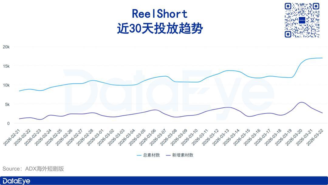 ADX海外短剧版数据显示,近30天,ReelShort投放力度呈明显上涨趋势,日投放素材量由最初的8千组左右上涨至近期的1.7万组左右,3月22日,ReelShort取得近30天最高素材量17015组。