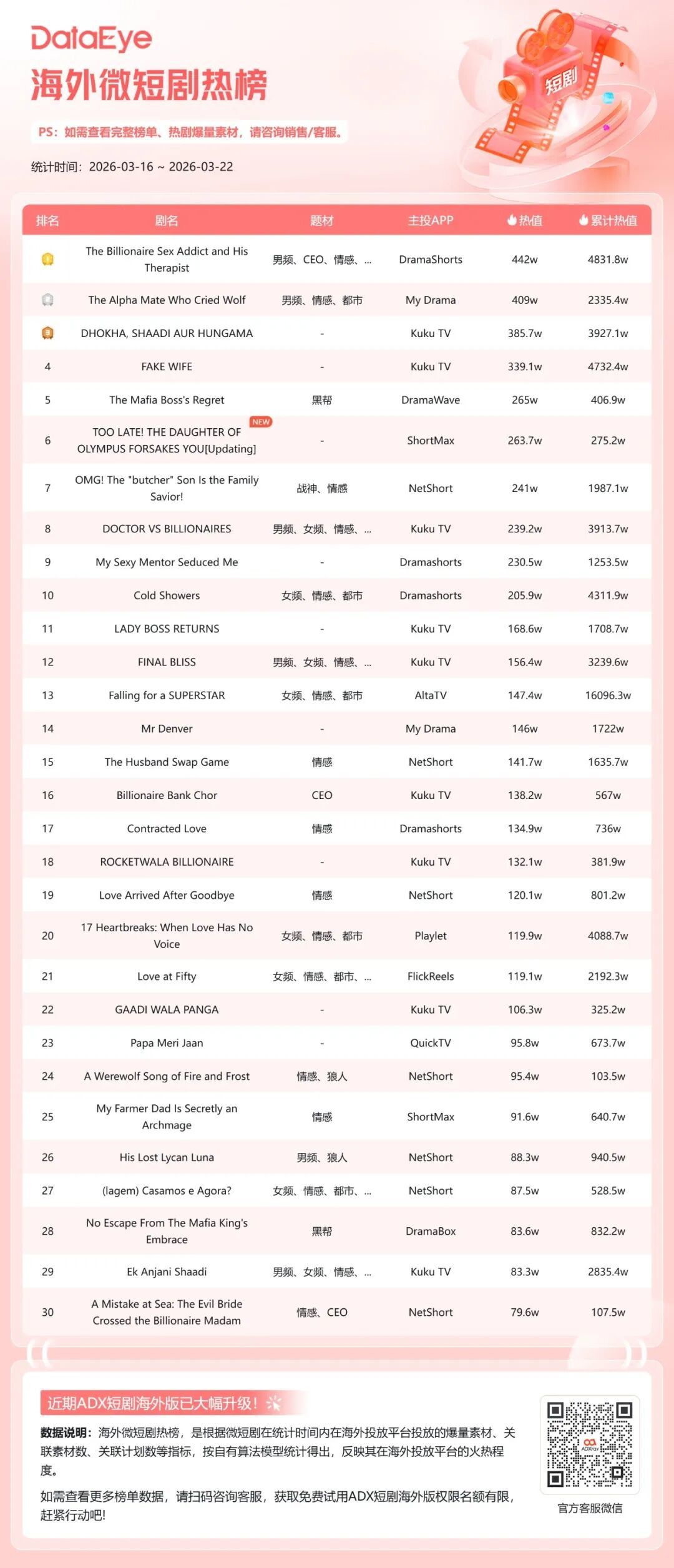 本期(3月16日-3月22日)DataEye海外微短剧热榜,《The Billionaire Sex Addict and His Therapist》蝉联榜首,热值442万;《The Alpha Mate Who Cried Wolf》位列第二,热值409万;《DHOKHA, SHAADI AUR HUNGAMA》位列第三,热值385.7万。
